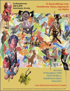 Τη Δευτέρα, 10/11/2025, στις 6 το απόγευμα, η παράσταση κουκλοθέατρου που έχει ετοιμαστεί στα πλαίσια του erasmus+ KA122 θα παρουσιαστεί στο Δημαρχείο του Κορωπίου σε εκπαιδευτικούς Πρωτοβάθμιας και Δευτεροβάθμιας Εκπαίδευσης. Είναι πολύ μεγάλη μας τιμή η συγκεκριμένη πρόσκληση και ευχαριστούμε θερμά τη Διεύθυνση Ανατολικής Αττικής και τη Σύμβουλο Παιδαγωγικής Ευθύνης, κυρία Χάσουλα.